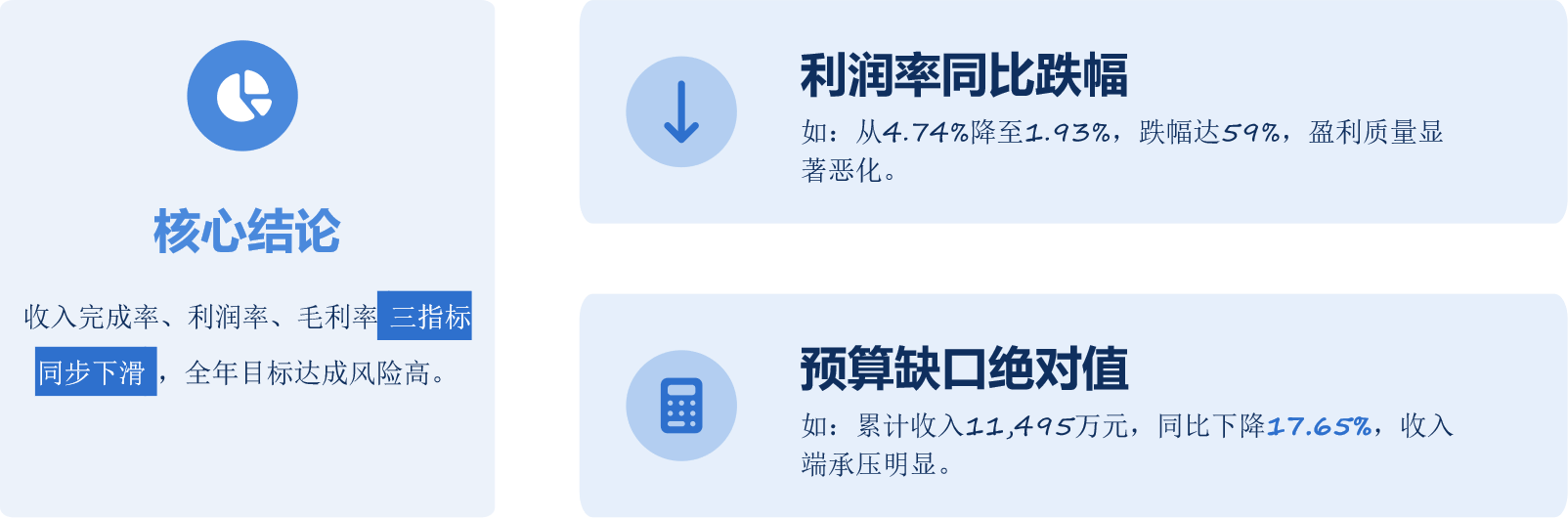 智能体将年度经营概况与同期对比浓缩为一句话结论,十秒内判断全年目标达成风险。