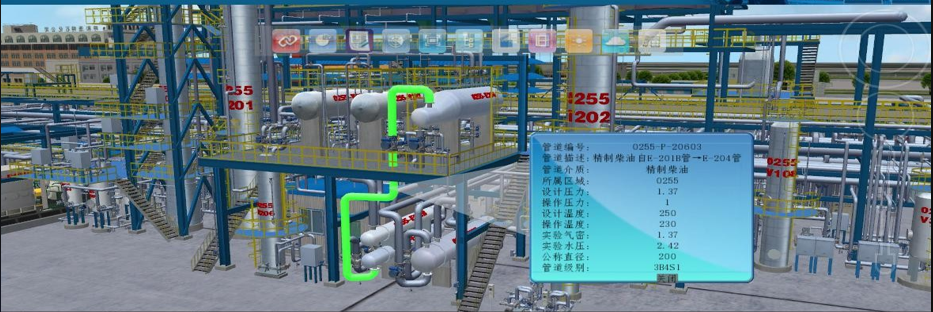 在厂区三维场景中,可以通过选择设备或者管线,直观的查看其压力、温度、介质、材质 等基本信息。