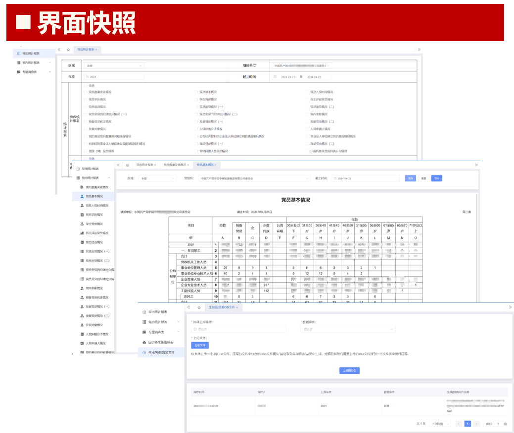 党内统计报表、专题调查报表、数据一键导出、数据文件转换。