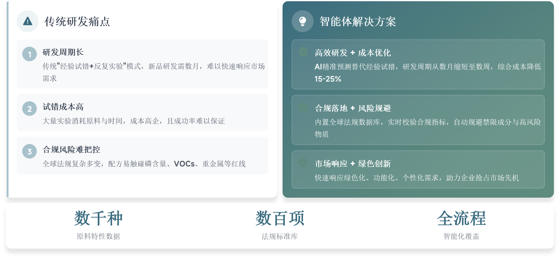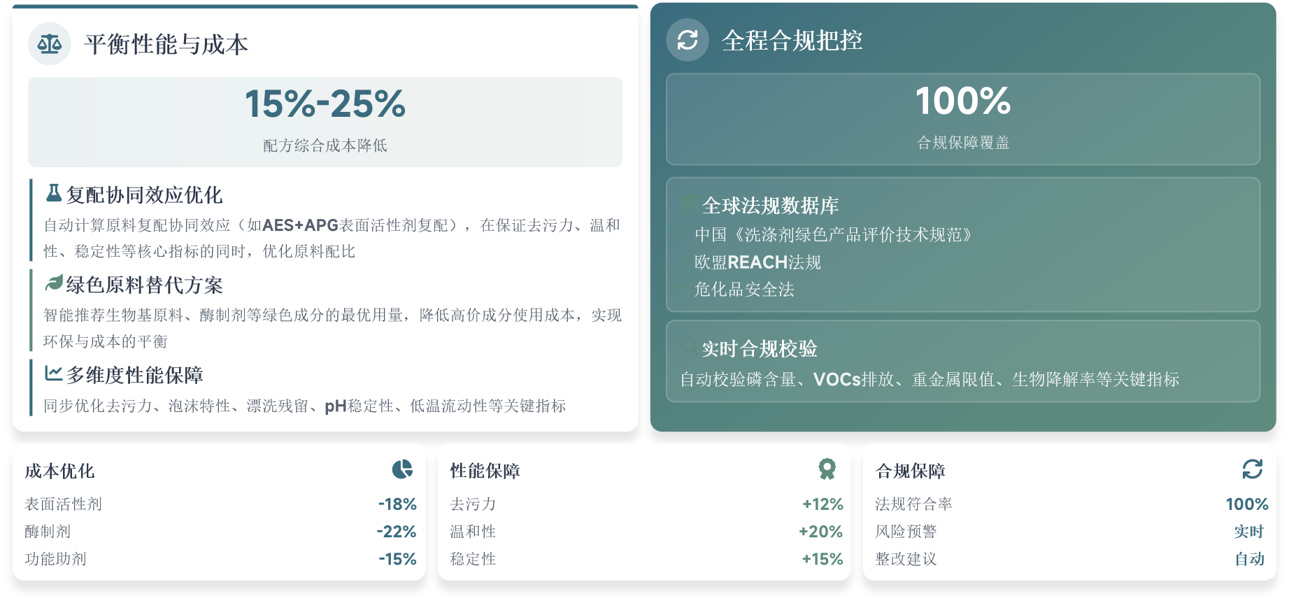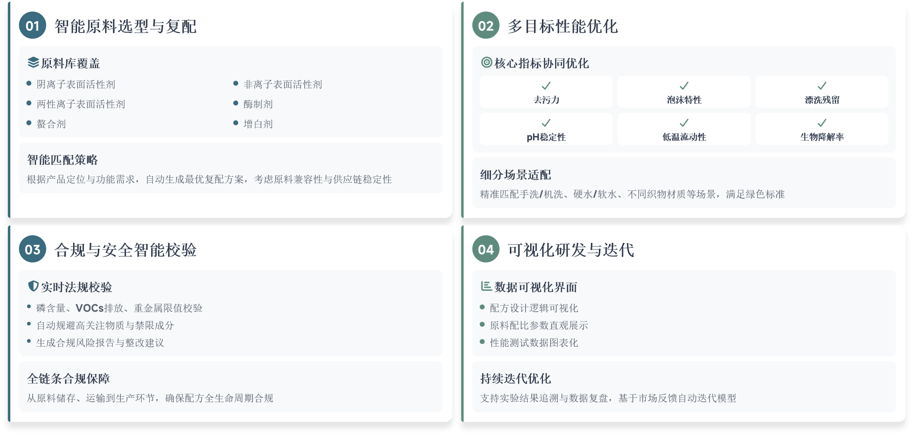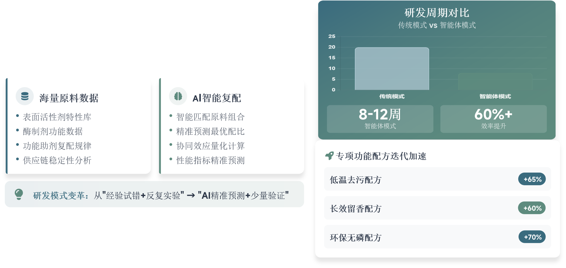 基于洗化行业海量原料数据与复配模型,智能匹配原料组合与比例,将传统"经验试错+反复实验"的研发模式,转化为"AI精准预测+少量验证"