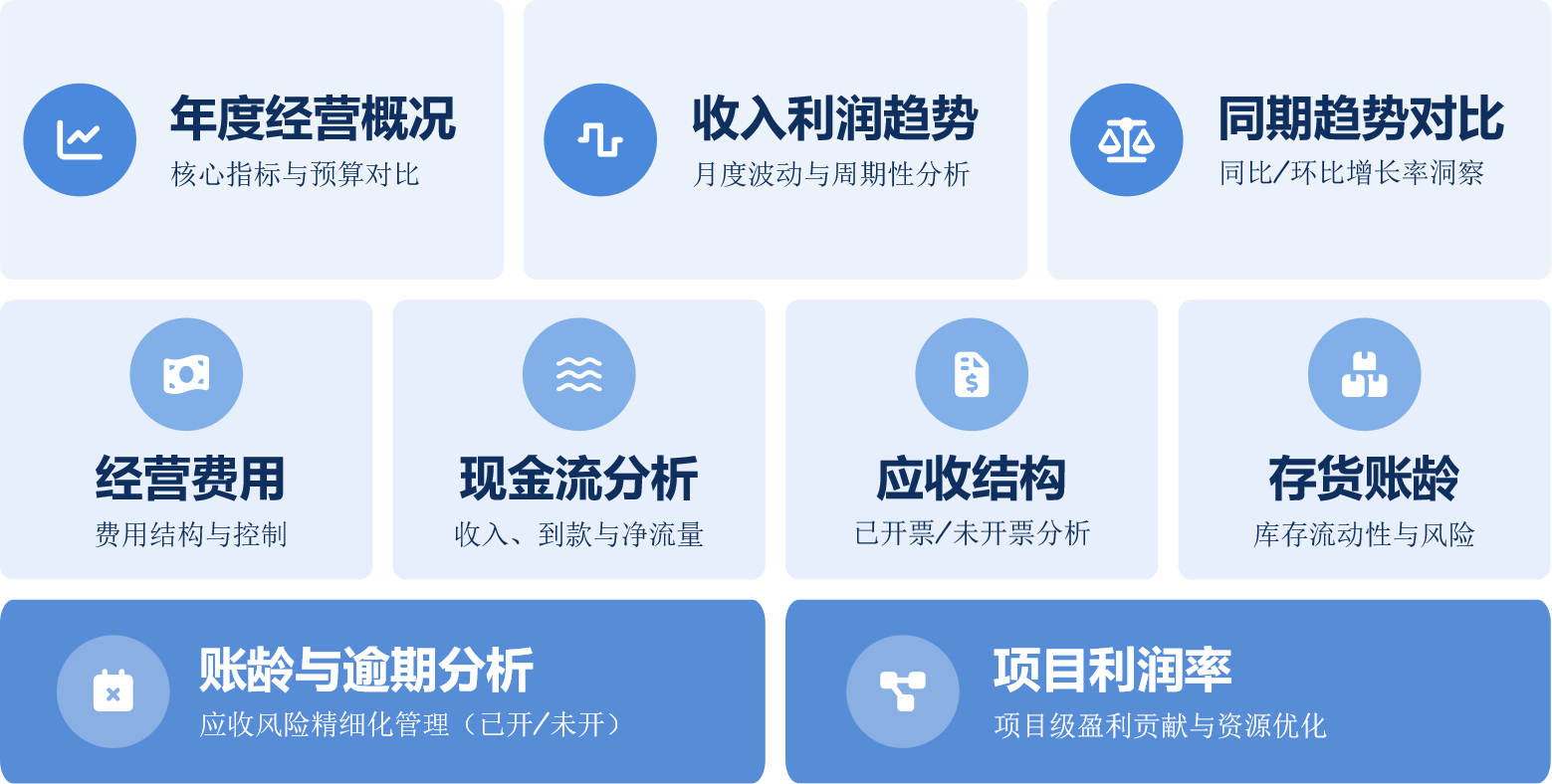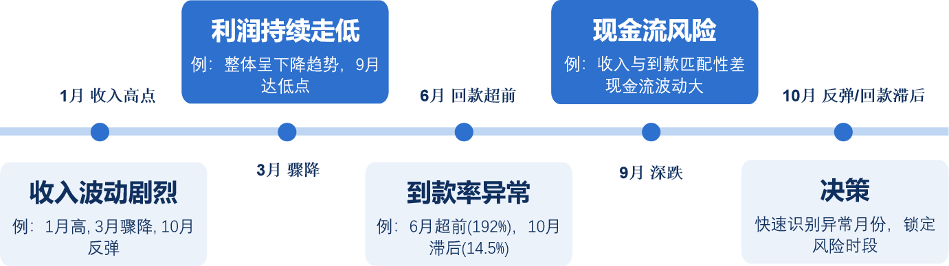智能体将收入、利润率、到款率三条曲线叠放在同一时间轴,瞬间识别业绩周期、现金流缺口与异常月份。