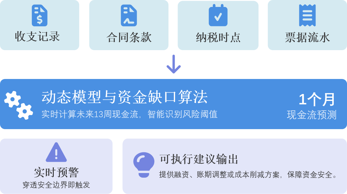 以企业收支、合同、纳税、票据四维数据为基石,通过动态模型与智能算法,实现 资金风险的实时量化预警 与 可执行策略 的精准输出。