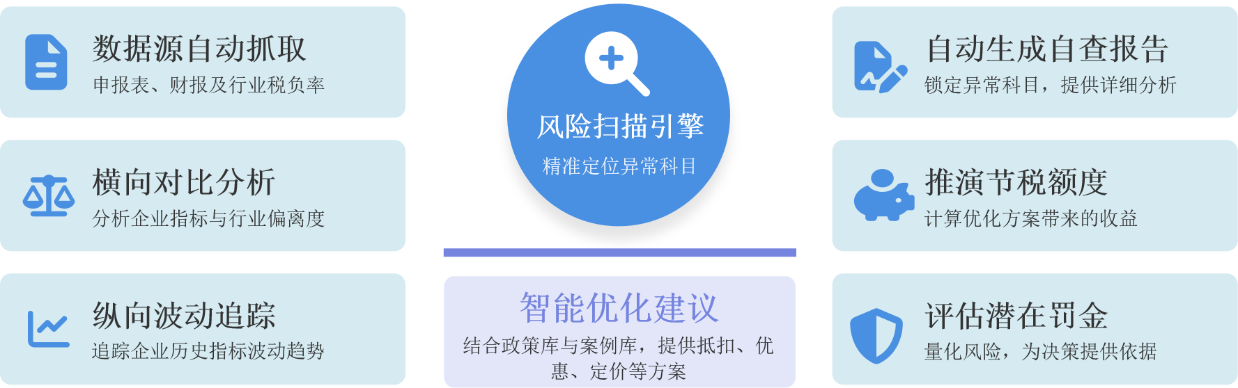 智能体自动抓取多源数据,通过横向与纵向深度分析,精准锁定异常,生成自查报告并提供优化方案,量化效益,护航企业税务合规。