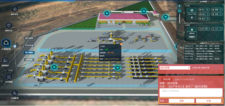 数字孪生工厂通过人员和车辆定位,通过GIS平台展现,直观的看到工人是否在工位上,连续工作时间,是否进入到危险区域,可以查看工人的信息和当前任务,也可以对每个工人下达工作任务和通知等。集成视频监控系统,对于工人是否佩戴安全帽,是否闯入非法区域等实现快速报警;查看特殊车辆和危化车辆的实时位置,通过园区工厂访客预约系统,实现人车信息绑定,实现园区内危化品传输存储一体化监测。