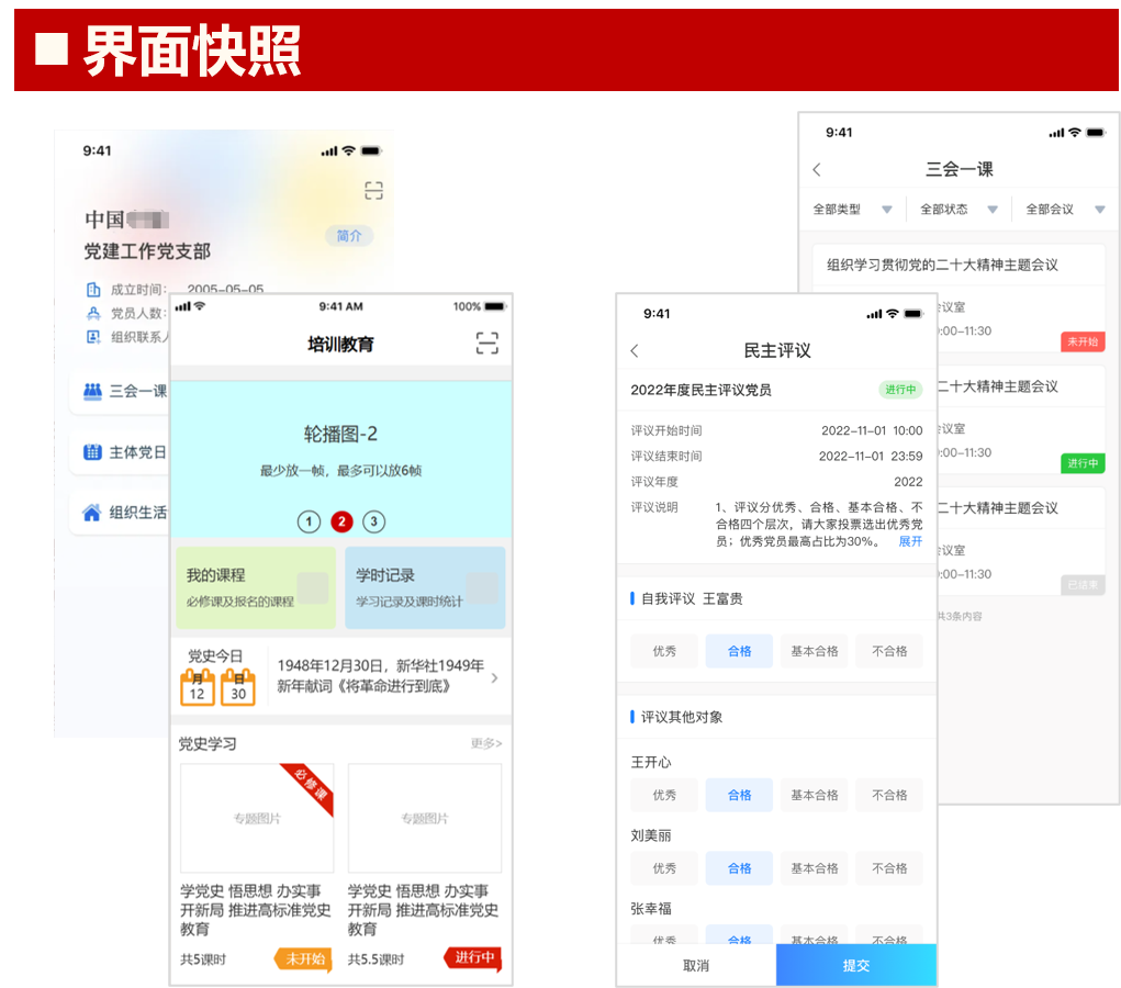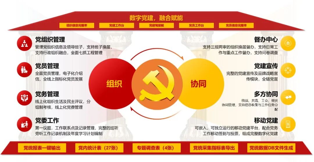 党务工作覆盖、线上民主评议、党费线上记录、全面线上考核。
