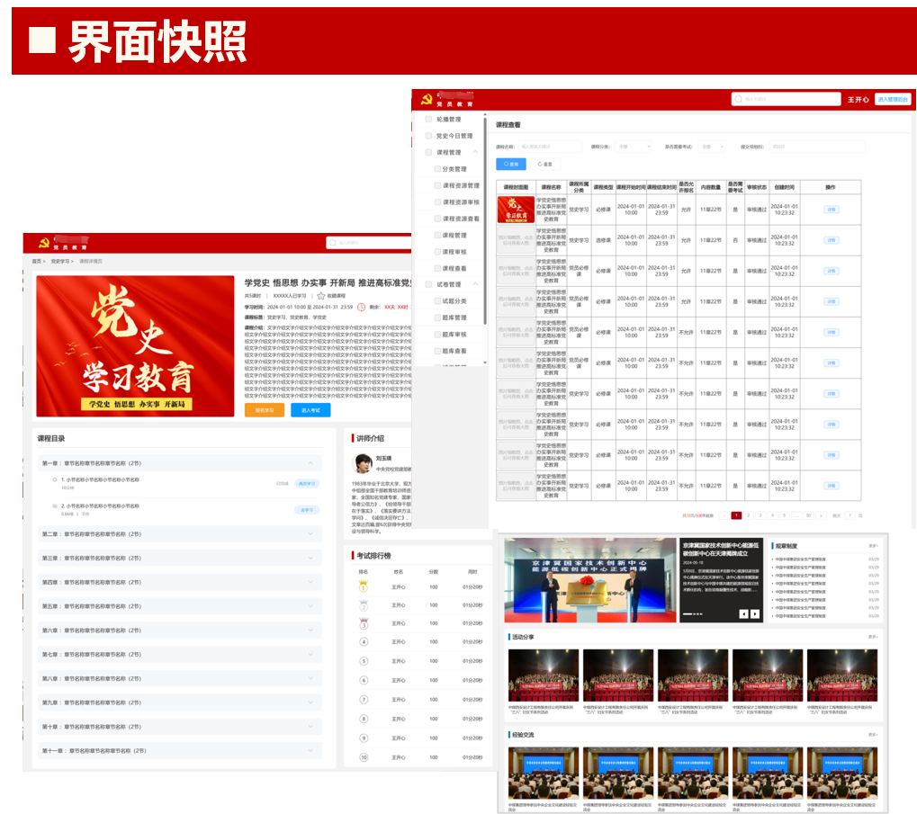 回顾党史今日、在线党务学习、课后专项考核、活动自主分享。